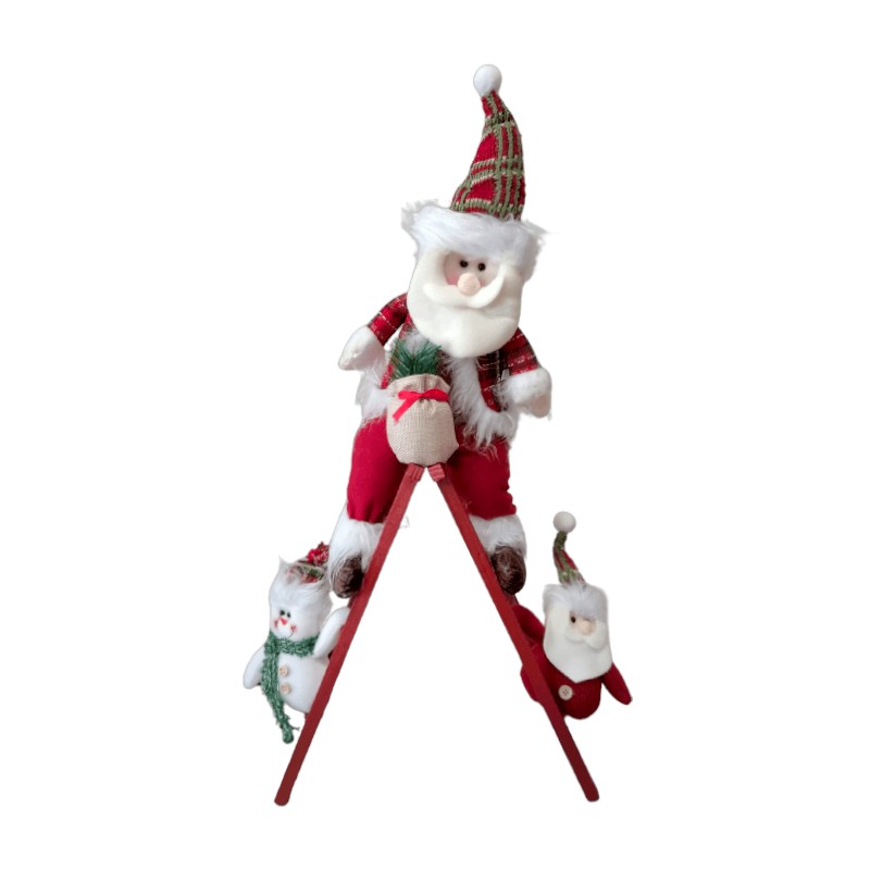 Χριστουγεννιάτικη, λούτρινη, διακοσμητική φιγούρα σε ξύλινη σκάλα, σε υπέροχο σχεδιασμό και εντυπωσιακές, ρεαλιστικές λεπτομέρειες.